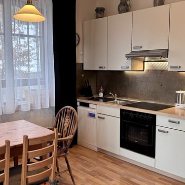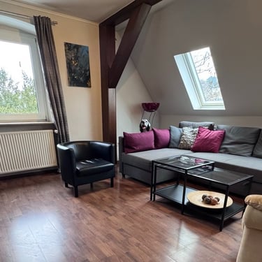 Das Apartment Nummer zwei ist ebenfalls sehr großzügig und befindet sich im vierten Stock der Drachenburg. auf circa 120 m². Ist Raum für bis zu sechs Personen. Der 12 m² große Balkon ist ebenfalls möbliert hat eine Grillmöglichkeit und eine schöne Aussicht ins Grüne.